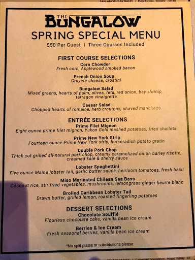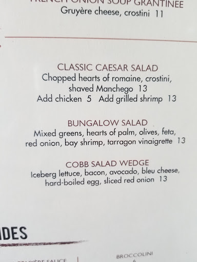 Wonderful spot for lunch. Aside from their regular menu - which has a nice selection - they offer a special $10 lunch menu with several choices. The Grilled Mahi Mahi with Wild Rice Salad is one of my favorites. The Bungalow Burger is also quite delicious.