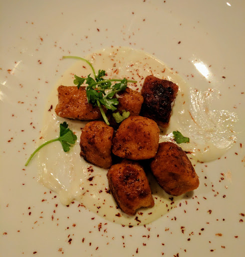 I spent some time with people from China who were only familiar with LA settings but not SD ambiance. As a SD local, I had the opportunity to show the out-of-towners a little bit of SDs foodie scene. On a Saturday night around 6:30pm, most of the outside tables were taken up because of the romantic fire lighting offered tableside. My party and I ate inside which wasnt as pleasing to the eye but it was fair in terms of seating arrangements. I think this establishment deserves 3.5 stars for both food and service. For service and friendliness-4 stars. Polite hostess. Polite waiter. The waiter was very helpful in going into detail about ingredients in each dish and recommended his favorites. He ran through the items really fast though and if I wasnt a foodie expert and Food Network fan, I would have been completely lost in his rambling (like my friend who sat beside me and tried to make sense of the waiters suggestions). The food choices we made were for the 4-course tasting for 85/person. It included a starter, another starter (2nd course), the main course, and dessert. Because it was a 4-course tasting, I did expect that portions to be smaller but I was really surprised by how little food we were served for the main course. Disappointed in their generosity but overall the Tuna Sashimi, white poached prawns, lamb rack, and pumpkin creme brulee were all delicious in their own way. Everything was made with great care and flavors melded well together. I also tried the oysters but they were not in season because the oysters were really small. In addition, the bleu cheese crusted filet mignon was kind of dry for being medium rare. Other desserts such as the chocolate budino (pudding) and the tableside vanilla ice cream made with liquid nitrogen were both really yummy. For dates or celebrations, this is a great place to go! However, theres not much that I would come back for because although the food was yummy, it was not mindblowing in the sense that I would need to come back to try other things.