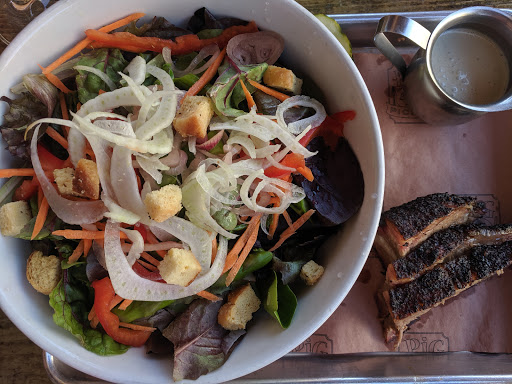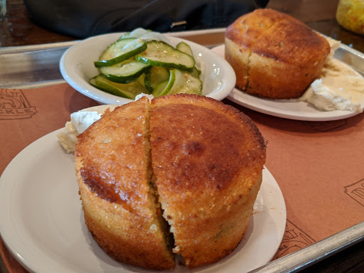 Cute little place you can usually smell from 101. Great brisket, BBQ sauce, and sweet tea. This Southern boy calls it spot on! Highly recommended. Can be expensive, but I recommend coming with a friend and splitting the 3 and 3 platter, maybe with an extra side. The sides we tried were very good: cornbread, potato salad, and Mac and cheese. My wife liked the chicken, which was perfectly tender and served in some kind of white vinegar based sauce that struck me as a little strange. Similarly, the pork ribs were perfectly tender but also kind of bland. I feel weird recommending maybe adding salt it BBQ sauce. I like the ambience and the indie rock soundtrack.