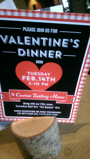 -Dinner review- Great Vibe with a relaxed hip atmosphere! Happy hour from 5-7pm, possibly every night...most likely Monday-Friday. But they do have late night HH 10pm-closing on Friday and Saturday. (HH includes food and drink) Skip the pizzas, crust is not thin enough, bit more chewy for my taste. Ingredients is fresh, but not my style = 3 stars. Salad is great: lightly tossed and fresh, enough to share with a party of four = 4 stars Rigatoni Chicken is delicious as well, creamy with mushroom, artichoke, tomatoes = 4 stars Overall, I would skip the pizza and try the other dishes. Wine, cocktails, and beer is available here! (Wine flights and some of the beers are on tap as well) Ecco is located inside The CAMP, not visible on Bristol Street. Bathroom is located outside. Service is attentive 3/1/2 stars). Great place to hangout with friends or a casual date. Plus, you can walk around the Camp afterwards.