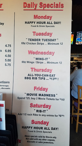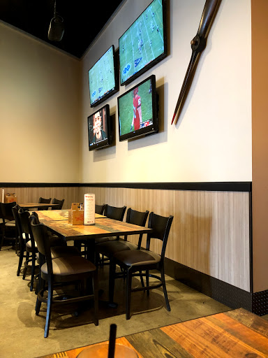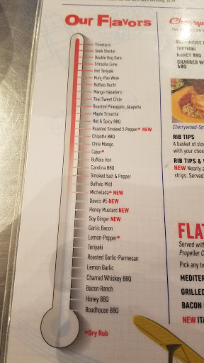 Great ambiance. Modern decor. Huge juicy wings. Home made potato chips. Home made Blue Cheese dip that is nicely milder than your average Blue Cheese dip. All of their breaded items are homemade with a nice coating. I especially like their homemade jalapeno poppers and their breaded zucchini and mushrooms. Wednesday is 79 cent wings! Thursday is all you can eat rib tips and chips and sides for $14. The Seek Shelter wing sauce is not that great. Its pure chili pepper with no discernable flavor. Just pure fire. The Double Dog Dare wing sauce is decent. It has a brown graininess to it and tastes kind of like a molassesy hot sauce. The Kung Pow Wow sauce is decent. Not that hot. Subtle flavor though. The Hot Teriyaki sauce is good. Not that hot. The Mango Habanero sauce is not that great. Its very gritty and not hot. The Brewski sauce is decent. It tastes kind of like a molassesy hot sauce with beer mixed in. Its spicy! The Daves sauce is decent. It tastes kind of like a RedHot sauce with some lemon mixed in. The Thai Sweet Chili sauce has awesome robust flavor. Its not spicy, but if you want it hot, theres a variety of hot sauce bottles on the table. The Garlic Parmesan sauce is actually very good. Its like they coat the wings in a garlic cream sauce, then sprinkle parmesan on top.