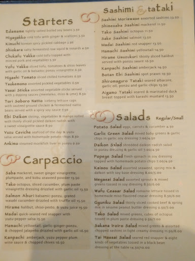 Gochi never disappoints. Ive been here for dates, taken friends for birthdays, and each time is just as special as the last. It gets crowded for dinnertime, so it helps to make reservations in advance, otherwise expect a looong wait. Must-gets: ankimo - the liver is cooked just right, and the ponzu sauce...drool any of the sashimi, but Im partial to sake and spanish mackerel gyutan - grilled beef tongue unagi claypot rice - so daaamn good! grilled pork belly green tea creme brulee Definitely ask the server for their own personal favorites. Gochi has a pretty extensive selection compared to other Japanese tapas place and the beautiful thing about tapas is that you can go wild with the menu, but still have so much more to try for the next time you come back...and you definitely would want to come back. I like sitting at the tables where you have to take off your shoes and sit Asian style. I love this place for medium-sized groups because then you get to order lots of different plates without feeling like such a porker, although that never stopped me either when I went with just one other person. Total tab for dinner can be lots of money...so Gochi can be a pretty expensive addiction =p.