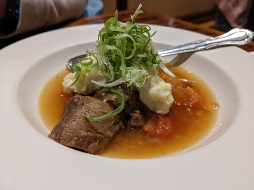 Gochi is my absolute favorite restaurant in the Bay Area! They are a Japanese fusion izakaya-style restaurant, meaning they serve tapas with beer & sake. The menu is enormous and includes stuff ranging from traditional Japanese dishes like crab cream croquettes to fusion food like mentaiko pizza. My favorite dishes are the gyuutan kakuni jaga butter (beef stewed in butter-soy sauce), yaki onigiri (grilled rice balls), mentaiko pizza (pizza with a very thin crust, topped with cheese, fish roe and mushrooms), and the green tea creme brulee. The yaki onigiri is the best yaki onigiri Ive ever had in my life! Gochi is a good place to have a large group dinner, because you can get one of the private rooms with tatami mats and shoji screens. Just make sure to get a reservation though, because its always so full. The atmosphere is usually pretty lively and its sort of on the noisy side. One neat thing I discovered about Gochi is that you can order a giant bottle of sake and theyll keep it there for you for up to 6 months. So the next time you come back, you can ask them for the bottle and continue drinking it. Gochis a bit hard to find, its in a tiny plaza on Homestead that doesnt have much else in it.