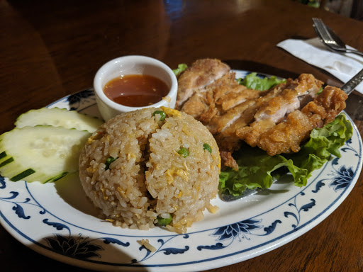 I came here because I just moved in the area and I was looking for a Thai spot close to my home to go on a regular basis.. Im picky and want an authentic taste. I get the same thing at all the Thai places I go to to gauge how they each make the same dish differently.. Food: I usually get the Pineapple Fried Rice. Here it was called the Bangkok Fried Rice.. It tasted as I expected, wasnt bad. Excellent. Decor: Loved the huge art piece on the wall that extends almost the length of the restauraunt. I could stare at that all day. And the statues arent bad either. Excellent. Service: Food came out fast and hot. They checked on me. Efficient. Excellent. Location: Kinda hard to find parking around that strip mall so I just parked across the street in the Home Depot parking lot. I found my new Thai spot. :)