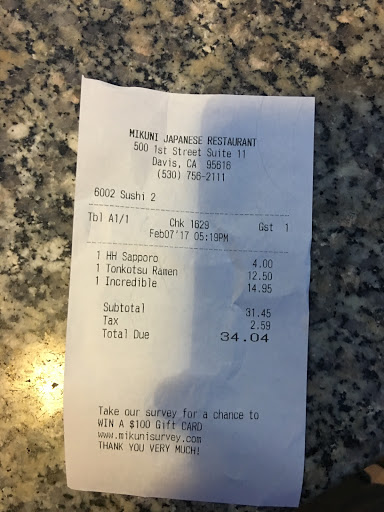Sushi was OK but not the price. Be prepared to spend much more here than other sushi bars. Sacramento versions of Mikunis are better than Davis, so if your going to spend that much money better to travel to Sac. l