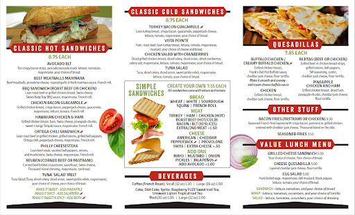 I eat at Vista Pointe Deli at least 4 times a week. They have a great variety of sandwiches and their lunch specials are worth the trip. Im a big fan of the staff there, all of them are kind, and friendly. I highly recommend you try out Vista Pointe Deli because you will not regret it. The prices are fair, and the food is fresh!