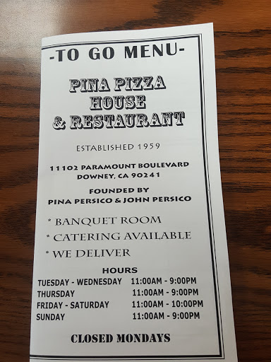 Good Food for many years~ Horrible Manager.... Customer DOES NOT come first..... Will order to go, will not EAT IN..... Until someones changes management Im afraid Pina Pizza will slowly start losing its long life customers~ I have been eating there for 30 years..... HOW THINGS CHANGE!