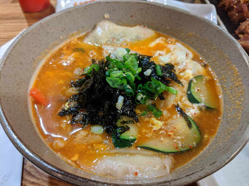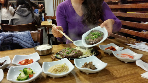 TL;DR - Great food. Clean restaurant. Adequate service. Ample parking. Will return again! Detailed review - We arrived around 7pm on a Saturday and were seated only after a 5-minute wait. I think we just beat the crowd, as the line grew pretty quickly after we sat down. Whew! The restaurant itself is clean with updated decor. They offer a good variety of menu items, including vegetarian options. The two of us ordered a seafood pancake, kimchi tofu stew (mild spicy), and galbi soup. The seafood pancake was thicker than some other ones I have had elsewhere. That said, it wasnt mushy; it was crispy on the edge and soft in the middle with plentiful seafood (read: big shrimps!). However, I think it could be a tad more flavorful though my boyfriend thought it was just right. The kimchi tofu soup was delicious and loaded with enoki and zucchini. Mild spiciness was more spicy than I expected. Could have been considered as medium in some other places. But it was still enjoyable. My boyfriend liked his galbi soup but wished they had given a little more meat. One disappointment that we both felt was surprisingly the rice. They added too much water when cooking, and it turned out too wet and gooey. It was probably just a one-off thing, so not a deal breaker for us especially since the rest of the meal was great for the most part. Plus, parking was easy with a private lot shared with some other businesses in the plaza. Will definitely return. Looking forward to trying their cold noodles during the summer! Note: Strollers are NOT allowed inside the restaurant.