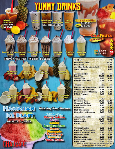 A bit pricey for what it is. Despite being called Cha Cafe, there is more of an emphasis on mixed fruit drinks and coffee than tea. Food options are your once-a-food-truck-turned-restaurant selection: pan-asian, mexican, and american fusion. Expect BBQ wings in your nachos. If youre in the mood for a step up from those Tea shop snacks (e.g., popcorn chicken), this is where you want to be (more fun after a few drinks!). This place is located in a strip mall, next door to a coin-laundromat. Staff can range from warm to cold in service, depending on the time of day. Their surprising social media presence and stalwart stand at the 626 night market are what most know them for.