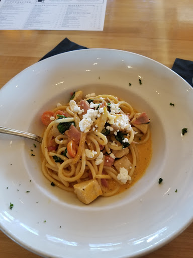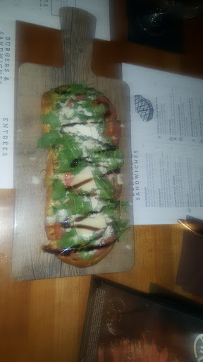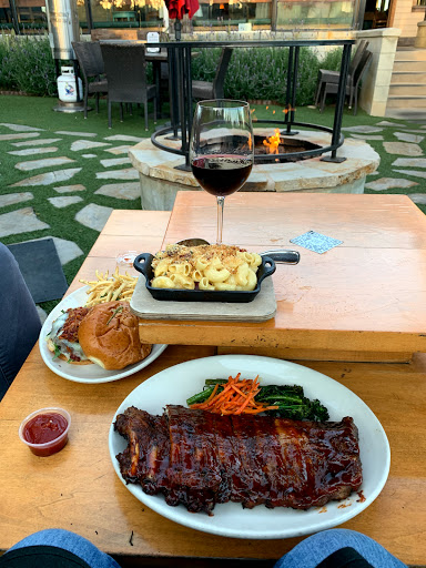 Stopped here for lunch. Decided on the bleu cheese burger. Burger could have used a bit more cheese on top, but was delivered with garlic fries piping hot. Service was excellent. Restaurant and bathrooms very clean. Decor in front of building is complemented with babbling water and fire. A little pricey, but would go again.
