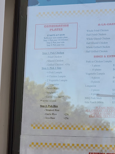 We ordered grilled chicken, fried chicken, two kinds of rice, vegetable lumpia, & chicken lumpia. Everything was great! We will definitely take our family back!