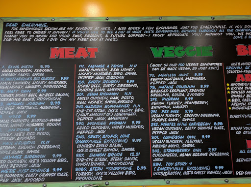 This place is wonderful for sandwiches! They have great service and fresh ingredients. I get the Sneaky Kitty with vegetarian bacon, vegan cheese and the vegan dirty sauce on Dutch crunch bread. Their menu in the restaurant has lots of choices and there are even more on the website. They are always quick to let me know the bacon is vegetarian and not vegan when I order my sandwich. They even pop a little lollipop in the bag as a treat. Ive been here many times since they opened in Emeryville and each time the service and food was very good. Love that kind of consistency.