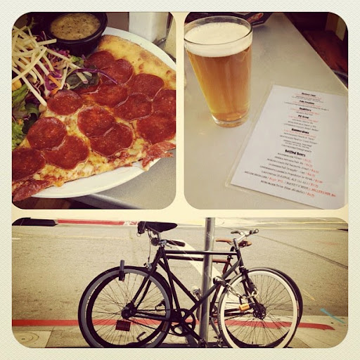 Very good pizza, thin crust gourmet. Huge sizes, a small gave 2 of us enough to take home! Great selection of craft beers and an industrial atmosphere with biker roots! A bit pricey but a solid value in quality!