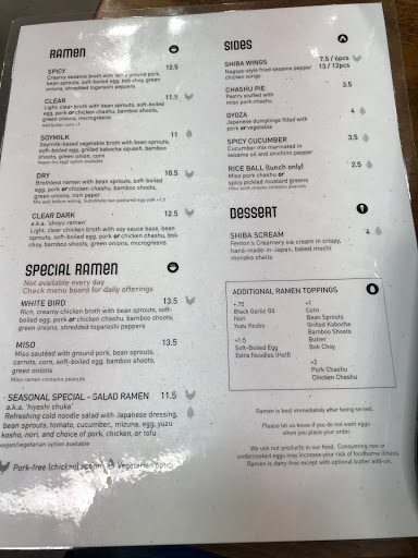 Good, not great, bowl of ramen. It is a little pricey, though. I find myself coming to Shiba Ramen whenever I have a hankering for some ramen and dont want to fuss over driving long distances and waiting in line. I tend to get the spicy ramen with an additional pork charshu. It comes with ground pork, which Im not a huge fan of, but its OK. Ive tried a few others and the only other I would get again is the White Bird. You can taste that Shiba Ramen puts a lot of care into their ramen. It may not be as punchy as other places, but its got a good balance and hits the spot.