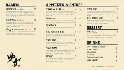 I ate at Yuzu Ramen & Broffee for lunch a week after its opening. I ordered the tonkotsu ramen. Overall, I am mixed about the ramen: Pros: - rich broth - fresh noodles - delicious chashu (braised pork belly) - perfectly cooked egg Cons: - broth flavors were muted. it was almost too rich, such that you couldnt pick out any particular flavors. you could tell there was a lot going on, but nothing in particular stood out. in the end, im not sure if thats a good thing or a bad thing. i did like it enough to finish the whole thing, something i dont normally do with other ramen broths given their saltiness. - small portion - expensive ($14)... wouldnt be too bad if the portion was bigger. The service was fast (even though I was told it would take 45 minutes, it only took about 10) and friendly. There is both indoor and outdoor seating. The outdoor seating area is great on a sunny day. I think the place has a lot of potential, but it is expensive for what you get. If youre looking for super flavorful (i.e., spicy and salty) ramen, this might not be it. However, the ramen here is satisfying, so much so that I drank up all of the broth. I guess that is their "broffee".
