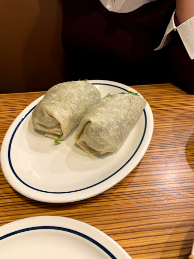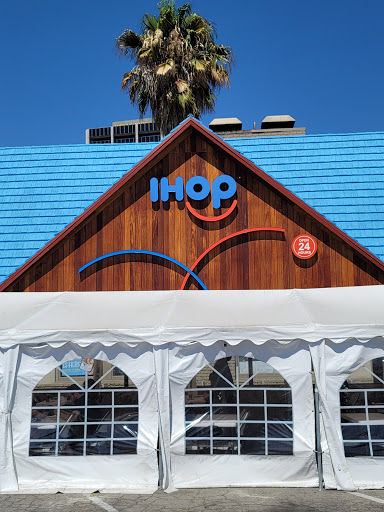The 24 hour American coffee shop is alive and well in this neighborhood restaurant, part of the International House Of Pancakes chain. Of course, they offer many styles of pancakes and traditional eggs and bacon. My wife enjoys the "Swedish" crepes with Loganberry sauce. Then theres chicken and burgers, just in case its 3am and you need meat. The staff is knowledgeable and friendly. The coffee is good and strong. Except for the side salad, no vegan foods are offered. Both patio and inside seating is offered. As visibility is key to a fast food restaurant, this early IHOP was constructed with the 1950s, blue roof, "A" frame design. The original IHOP was built in Toluca Lake, a few miles to the East. Wheelchair accessible with some difficulty. Parking is free but very tight.