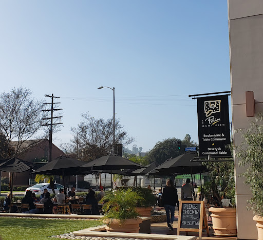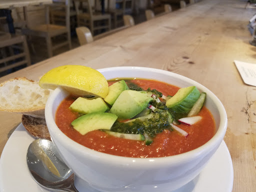 A lovely, French style, organic restaurant and bakery. The vegan gazpacho soup is served with crusty French bread complete with an olive oil and balsamic vinegar dip. A very special treat on a warm California day. Friendly, knowledgeable and fast service. The large menu is marked with vegan and gluten-free items. Free WiFi. Everything is wheelchair accessible including the bathrooms. Patio and interior seating. Free validated parking. There is a table that seats twenty or so, lots of smaller tables and highchairs for the kids. The restaurant is located in the original Producer Alliance Building. On the walls, around the courtyard are mosaics of famous Academy award-winners.