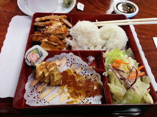 I went here during the recent Comic Con, so the place was slammed and that wont be taken into consideration. The wait staff were all wonderful and nice. My wife and I each had a different bento lunch, hers being the salmon teriyaki and mine being the beef. The portions were okay, the large serving of rice being the most generous. The salad had ranch dressing on it, which I found to be really odd for a Japanese place. It also included a piece of melon which, again, struck me as odd. My beef was okay, somewhat lacking flavor besides the sauce they use. The California rolls were good but nothing extraordinary. Overall, it wasnt bad at all but nothing seemed to strike me as being better than ok. Typical boring Japanese place with really nice servers.