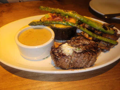 Traveling for business, called to see how busy, the hostess let me know possible seating at the bar. I gave it a shot. I was seated at a table, had the most stellar waitress: Chelsea. She had the tv changed to the SJ Sharks game, and was the perfect server. Not hovering, yet observant enough to tailor to her tables. I chose the NY strip; perfectly cooked, my beverage: double dirty greyhound was well made. Additionally, a great overlook of the bar , enabling a pure comedy show of folks enjoying the ambiance. At first pricing seemed steep, in the long run, the quality of food deserves the price. I will definitely return to this restaurant when I return to this locale.