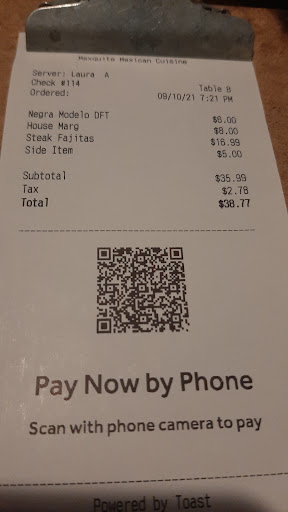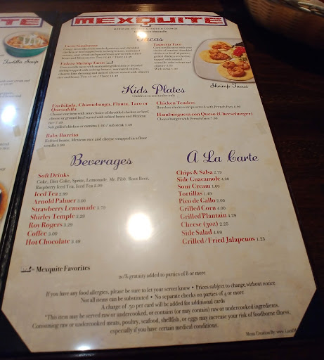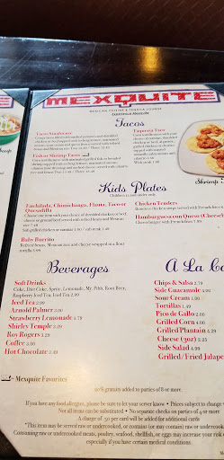 Just took the family to Mexquite mexican food here in Folsom. Heard good things about it so wanted to give it a try... Rice = so-so; Beans = average; Salsa = blah; Bean-dip = average; Childrens Plates: Chicken Strips/Nuggets (not sure what they were to be honest) = Dry and hard. Hamburger = Dry bun with patty, NOTHING else. Quesadilla = my 5 year old ate the whole thing so Im giving it a thumbs up. Dinner Meals: Steak Quesadilla = Steak was TERRIBLE. My wife ordered and I sampled the steak. It had NO flavor whatsoever. Mole = Tasted like barbecue sauce with some spices added to it. Was not mole sauce at all. Carnitas = Dry and stringy. I would be willing to bet it was about 3-5 days (prob more) old and they added boiling water to it to try and revive. It tasted as though it was sitting around for 8+ hours non-refrigerated. It would have served me better picking up a bag of beef jerky at the gas station and throwing that into a tortilla and adding sour cream and guac. Summary: On a scale of 1-10, I would give this place a 1.5. Only because the service and atmosphere were decent. And because we didnt get any alc beverages so Im giving them the benefit of the doubt that they can pour a glass of beer from the tap without screwing that up. Prices were average to average high but based on the quality of food, WAY too high. Average dinner was 15 bucks. I cant emphasize how disappointed we were. I thought about talking to the manager, but I just figured Id pay the bill, get outa dodge, and add that to the list of establishments never to return to. To give you an idea of how disappointed we were, we didnt even stay for the free ice cream the kids got with their meals.