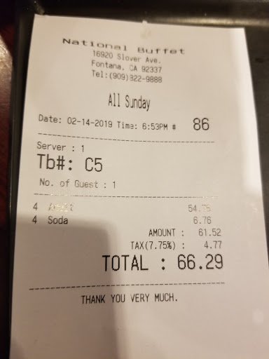 Hii. Do you like to eat chinese foods? I just found a very recommended restaurant and make you want to go there again. Why? Because the National Buffet restaurant in Fontana provides a very good service to its customers and it makes me comfort enough because its very clean.. And the most important thing why I want go there is because that nice girl who stands in front of desk. She is very kind!