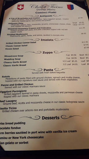 We were looking for some good comfort food in the neighborhood tonight and found Chalet Ticino. Renamed to better reflect its Swiss Italian food, this gem in Foster City serves fantastic classics at affordable prices. The owner himself provided great service along with the wait staff and recommended a fantastic wine to go with our lamb and steak. Before that we started with the Italian wedding soup and Caesar salad. Both were as good as home made -- fresh and delicious. The owner also recommeded the chocolate souffle for dessert and it was outstanding. Overall a great little place with good service, great food, and a charming atmosphere.