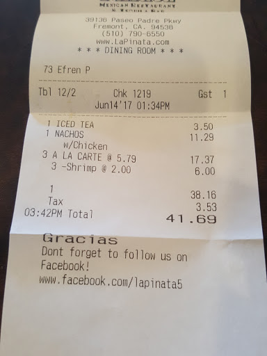 My wife and I like going to this Fremont location of La Pinata! We have never been disappointed by the service or the food! Also, recently they did a special Tequila Tasting at Ohlone Cigar lounge which was excellent - the lady was very knowledgeable about the various levels of tequila. Certainly if you hear about one of their local area Tequila Tasting events, attend!