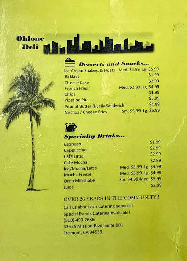 If my memory stands correct, the first time I went to the Ohlone Deli was a year ago, when I went to the annual theater competition up at the college right across the street. The food. Is. Delicious. The service is quite polite and friendly, though they dont quite hold a conversation or anything. It might take a while to get out to you, depending on how busy it is, but its so worth the wait. They serve an amazing variety of foods; sandwiches, milk shakes and other desserts, fries sprinkled with pepper and salt, and gyros so good youll die and go to food heaven. By all means, check this place out. It might not seem like much from the outside, and the inside isnt that impressive (though its got a quirkiness that is endearing), get some of their amazing food and sit outside on a sunny afternoon, and your life will be complete.