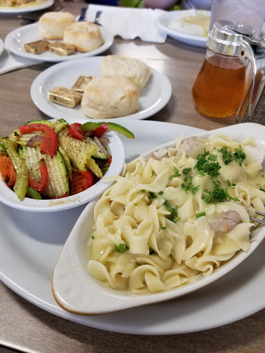 My wife and I did fell like we waited awhile for the order but when it came we did enjoy it. The chicken pot pie was tastey, I believe it has some white pepper in it. The restaurant is very large and would work well with large groups.