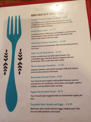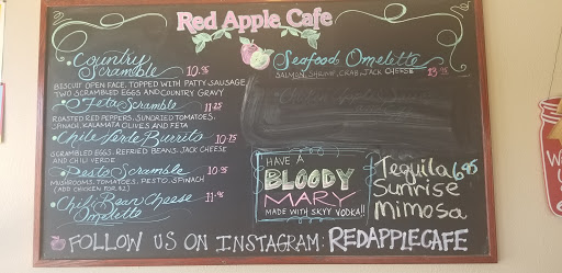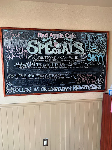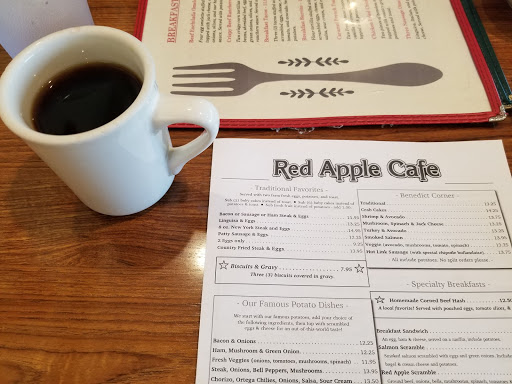 My family and I love going to Red Apple Cafe. The service is great! Our drinks are always refilled and the food is absolutely delicious. Weve always gone for breakfast. My fiance tried one if the specials, steak and potatoes with eggs, and the meat was juicy and tender and the potatoes were crispy. Their pancake special is perfect too with 6 smaller pancakes and bacon or sausage and eggs. My fave!