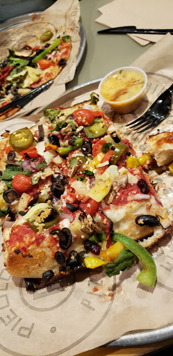 I like these places where everyone can get what they want. It satisfies picky eaters. And no one has to settle. Pieology is great because the toppings are unlimited. Everything was fresh, tasted great and was quickly served to our table. I love the variety of toppings and being able to get something different since it is all yours. No one would eat my all veggie pizza. The only complaint is the place is really loud. Chairs that scrape and squawk on a cement floor coupled with loud music and a interior with no noise reduction features, created a meal where you cant talk during the meal when it is busy. And it was busy. We pretty much hurried up and ate, which might be their goal. Get you in and out fast! Good food - loud place.