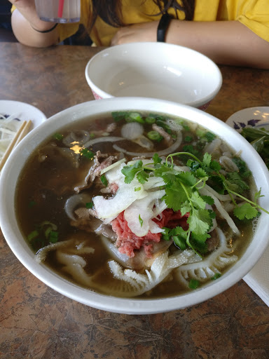 A couple of friends and I stopped in here for dinner on a rainy weekday night. None of had been here before; we were just looking for a well-rated pho place somewhere between Long Beach and West LA and this seemed to fit the bill. Its a pretty good-sized place and was clean. It was also all decked out in Christmas stuff and had a particularly annoying motion-sensored Santa that would boom out "Merry Christmas!" and "Ho Ho Ho!" every time someone moved anywhere near it. After about the 20th time we were totally over it, but then a baby started crying nearby and we traded one annoyance for another. Anyhoo, on to the food: We ordered their basic combo pho, and the small bowl was big enough for me, even though I was pretty hungry. It was good, but I cant say it blew me away. The produce, meat and noodles were all fresh and the broth had a good flavor--it was a perfectly good bowl of pho and hit the spot. The waiter helping us out had limited English but was very friendly and smiley, which is pretty unusual for a place like this, but then again looks like they cater to a largely non-Vietnamese clientele.