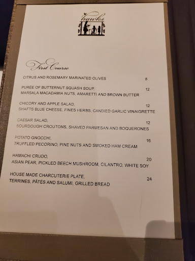 If you are looking for bold new flavors and quality ingredients, Hawks is a great choice. An Endive salad isnt new but a salty vinegaret with peach slices to contrast is a bold flavor. The pork loin was cooked to perfection. the roasted corn soup used a avocado sauce to realy enhance the flavor and texture. Ill tip my hat to the chef, push the envelope a little and be cutting edge. The wait staff needs a mentor. On every course, we were asked if they could take the plate. No indication was given that we were done with the meal. My companion and I were in a running conversation and slowly consuming our plate. This happend with the soup, salad, and the main course. it happened not once with each plate but multiple times. the wait staff should be taught to recognize when the clients are finished with thier meal. We felt rushed and uncomfortable. my second recommendation is to pass on the fixed menu. Watching other tables that didnt order the fixed menu seemed to be better timed. Order from the menu and pair your own wine. the wine paring was acceptable but not spectacular. the syrah went very nicely with the pork loin but the late harvest Vignier was too sweet for desert. It was more acceptable as a digestive. Give this place a chance, but know before hand what you want and you will find that they will toe the line .