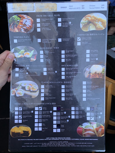 Wow. This place gets packed. So packed that they actually enforce the 2 hour time limit as they literally book their reservations back to back. We did the AYCE and how it works is that you can order 3 items/dishes per a person at a time. We had 7 people so we could order 21 dishes at one time and once we finish all that, we can order a next round. The cool thing is that if you make a reservation, they can send them an email of your first round of orders and they can start cooking it once you arrive instead of using up your time to pick from the menu. Let me tell you – 3 dishes/person is not a lot. That’s like 3 handrolls, or 3 nigiris, or 3 appetizers. The dishes are all super small and if you have a big group, it gets eaten up really fast. We found multiple times where the food would come and we would eat it and then we would sit there for a while before our next order comes. There was one point where we waited half an hour with no food! That’s a quarter of our time there! The staff was actually really nice and let us know when the sushi counter was backed up and I appreciated the courtesy, but that didn’t put food in my mouth. Our 2 hours were coming close to an end and I wasn’t full yet. I was getting annoyed that our food came so slowly and I was going to be super annoyed if I left still hungry. They were super nice and let us stay an extra 15 minutes but probably because we placed an order and it hadn’t came yet so it gave us some time to eat it. They also give you a scoop of ice cream at the end, but it’s hard to enjoy when they kept reminding you of the time. Overall, I didn’t really have a good experience here. Everything was so limited and it was hard to enjoy and I felt rushed the. We got a mix of apps and sushi and they were all alright. A few items were pretty good, but the portions are super small. I rather go to a more relaxed AYCE place.