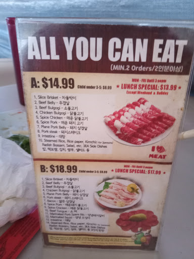 This place was pretty filthy i understand that theres alot of grease in the air but come on clean the place there was grease dripping off there video surveilance cameras the meat was horribly cut not to mention filled with major amounts of sodium and there were no veggies to put on the grill just plain meat and some horrible salads that they slop on the table oh and the place has a B from the health dept i cant believe they even got a b i was sick the rest of the night. never again the closest im coming to korean bbq is some ribs and terriyaki sauce on my bbq