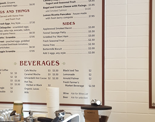My boyfriend and I love coming here for brunch on the weekends and Ill usually come in when Im working from home for lunch. They have a different menu for the weekend than for weekdays. Weekends use the brunch menu and weekdays use the lunch and breakfast menus. For lunch on weekdays, I usually get the turkey sandwich. Pretty tasty and not heavy, so I dont feel like Im overeating. If Im feeling hungrier, Ive also really liked the chicken sandwich and the burger (which I usually get with gruyère and avocado). Be forewarned that the burger is usually stacked pretty high, so it can be quite the mouthful! The brisket sandwich is pretty good too, but not my favorite. The green goddess salad is pretty good and Ive also generally enjoyed their soup. The brunch menu is the best. I always get the eggs A street with a side of sausage patties. The eggs A street is such a wonderful, healthier take on eggs benedict (which they also have). It has such a nice flavor and I much prefer the creamed artichoke sauce over hollandaise. The sausage patties are amazing! Ive always been tempted to get the hunters hash, but it always seems like a crazy amount of food and Im usually stuffed after the eggs A street. Ive also had the eggs benedict here and the breakfast sandwich, which are good, but not nearly as good as the eggs A street. The cannery also hosts a monthly pop up dinner that is usually really good. Definitely check that out if you like the menu!