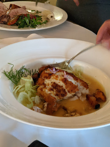 My husband and I came here for dinner after a days of wine tasting. The awesome thing about Dry Creek Kitchen is no corkage on Sonoma Wines. We brought in one of our purchases from the days tasting and enjoyed it with our meal (saving us quite a bit). We ordered for our appetizers: Scallops - served in a puff pastry with 2 large scallops. The sauce was a bit salty for me. Risotto with shaved truffles - The risotto was cooked al dente and there was a decent amount of truffles shaved tableside. The waiter came to the table with a small black chest which as 4-5 truffles. She then shaves the truffle tableside on top of the risotto. Mains: DUNGENESS CRAB STUFFED PETRALE SOLE - the sole was a little dry, but overall the dish was unique with the crab. DUROC PORK DUO - both pork pieces tasted very different and complimented each other well. I preferred the crispy belly. We also shared the MUSHROOM SHORT RIB FONDUE - which was nothing spectacular (the dishes come with sides and are large enough that we should have just skipped on this add one) Dessert - peanut butter pie. Good, and worth trying.