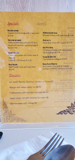 Love this place! I eat here weekly. The Tom Kha Kai (coconut chicken soup) is my all tie favorite. I am also super into the Pad Kee Mao (pan fried wide flat noodles with basil, I like pork for mine). Pumpkin Curry with beef, Duck Basil, I mean shoot its all pretty darn awesome! :)