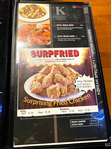 So I realized my last visit here was in 2008. And if a place has been around that long, it shouldve improved right? The service was definitely better and they also have lunch specials now (even on weekends) But we opted for the $20 Half and Half which was 5 pieces Olive Chicken and 9 pieces of Sweet/Spicy. I wouldve preferred it, if the 9 pieces were olive chicken though as the sweet/spicy gets overpowering. The olive chicken was really good though, and had a super light batter. It came with a bowl of radish cubes (love) and a plate of cabbage drizzled with thousand island. Maybe its just me, but regardless of olive oil preparation, anytime I want fried chicken, Ill still automatically think of Popeyes first. xD But this place is good for KOREAN fried chicken with the super crispy light batter. Try the lunch specials first ;)
