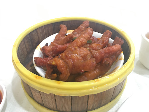 On a Lazy Sunday afternoon at about 1PM, we decided to go to China Garden in Irvine for Dim Sum. There were only 2 of us and when we arrived the restaurant was full, but clearing out. There were several people waiting outside. However we only had to wait about 15 minutes. We were sat in the infamous "side room" and I recalled all the posts about how the side room was one of the worst places to be sat due to the fact that people feel that the carts dont go into this room as often as the other room. We did not find this to be true. As a matter of fact, the second we sat down, there was a cart there and the Dim Sum girl was already barking out what she had to offer. Carts continually came and so did the people with trays. So I didnt experience the lack of carts that many others have talked about. I am convinced that these girls are on some sort of commission system or if they dont sell enough they get tortured in the back. They always slam things around and yell out the selections like they are mad at you. They get pretty pushy at times. I am not Chinese and they seem to get annoyed that I can not understand what they are saying and have to point or ask them to show me what they are referring to. And if you dont take what they are offering, you always get "the look". Notice how this Dim Sum girl is all smiles. These behaviors are not unique to this place. I think its most Dim Sum establishments. The Taro Cake was pretty good. I think it could have been fried longer to develop a crispier, more carmalized skin. I liked the gooey texture of the inside with the chunks of taro. My mom makes this and I hate to say it, but its not as good as mom makes. But its still very good here. Somewhat bland, but in a good way. Drizzle with a little soy sauce and you are good to go. The Har Gow tasted good enough. I have never been to a Dim Sum restaurant where I did not like these. I suppose they could have been a little more delicate with a thinner skin, but they had a very mild, yet tasty flavor and when you bit into them, it seemed like they were full of filling. The Shu Mai were very meaty and dense and had a great peppery flavor to them. Nice size to them as well I enjoyed the tripe. Thin ribbons of tripe in a gingery sauce. The tripe was delicate, firm, and chewy. You need to eat this one rather quick because as it cools the sauce starts to thicken and gets kind of gloppy. But I really loved the flavor of this one. Very Clean and crisp. The pork riblets were tasty. Perfect saltiness to them and they had a nice anise flavor to them. Lots of meat on these and the meat was very tender and came off the bones easily. They had a dish here that I really havent seen before. The angry dim sum girl called it "Skweh". I would say "Squid?" and she would say "Skweh" again. So I assumed it was squid and luckily it was. However these pieces must be cut from a BIG squid. Big pieces of the top of the squid that comprised most of the dish. Then there were pieces of the tentacles, but very large pieces. So much so, you really couldnt tell they were tentacles. It was in a curry flavored sauce and I really enjoyed this. It wasnt tender, but it wasnt tough either. I would say it was "firm tender". . My favorite Dim Sum dish is chicken feet and China Garden has the best out there in my opinion. I love this dish so much, it deserves its own picture. Deep fried first and then steamed. Completely tender and falling off the bone with so many complex flavors going on. Anise, sweetness, spiciness, saltiness. Nice and chewy tendons. I could eat 3 orders of this stuff. Its like candy to me. They didnt have the yellow egg custard cups that I love. I guess its because we came so late. But everything you see pictured was $23.00 including tip and that served 2 people. In my opinion China Garden does Dim Sum pretty well. And thats from sitting in the "side room" as well.