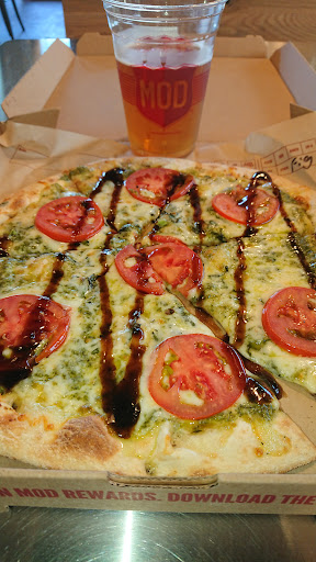 According to the employees here, this place is "THE ORIGINAL super fast pizza" place and Pielogy/Blaze are just copycats. I havent looked into whether this is true or not, but I did enjoy my meal at this place and felt that the quality here was a bit better than Pieology or Blaze. Once you park in their large parking lot (shared by the other businesses in the plaza), you walk in and order at the counter. You can either get one of their pizza or salad selections or make your own. Unlike Pielogy or Blaze, however, you dont watch them assemble your pizza as you list the items that you want. You go ahead and list all the pizza sauces and toppings that you want, they jot it all down, and then you pay while they assemble your pizza for you and cook it. Apparently knowing what all the ingredients are going to be before they assemble makes for a more balanced pizza? I prefer watching them assemble the pizza so I can ask them to add more of a particular topping if necessary, but this does seem more efficient. They offer 3 options for their pizza: you can get a mini (6" crust) for $4.77, the regular MOD (11" crust) for $7.47, or their Mega (11" double crust) for $9.47. I got their regular MOD pizza, but with gluten-free crust for an extra $2. Toppings are completely unlimited, so I got the following: MOD Red Sauce, Garlic Rub (yes you can mix sauces), Mild Italian Sausage, Salami, Bacon, Extra Garlic, Rosemary, Chopped Basil, Pineapple, Sun Dried Tomatoes, and Mozzarella. You can also add knots (garlic, cinnamon, chocolate, or strawberry) to your order for an extra $3 but I didnt get any. They have a decent amount of indoor seating as well as an outdoor patio. Soda machines are self-serve and the womens bathroom was pretty clean. I really liked how my pizza came out. My gluten-free crust was not ridiculous thin and/or burnt, which is quite impressive. I was very happy with my crust. I was also happy with my toppings, although I feel like they were not evenly distributed. All my garlic and bacon were in the middle of the pizza; actually, most of my toppings were concentrated in the middle of my pizza so the closer I got to the crust the less toppings I had. Nevertheless, it was a delicious filling meal that I enjoyed. I would definitely come back if I was in the area and had a pizza craving.