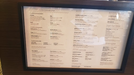 One of my favorite spots to eat at lunch time. The line moves quickly so its a good place to stop and eat during work hours. I love the arugula salad with the steak. If you have not tried this place, you must go in and eat it. It looks like it might be a fast food joint, but its not. All the vegetables are sourced locally and tastes super fresh. I love taking home food for the kids when Im in a pinch for what to do for dinner.