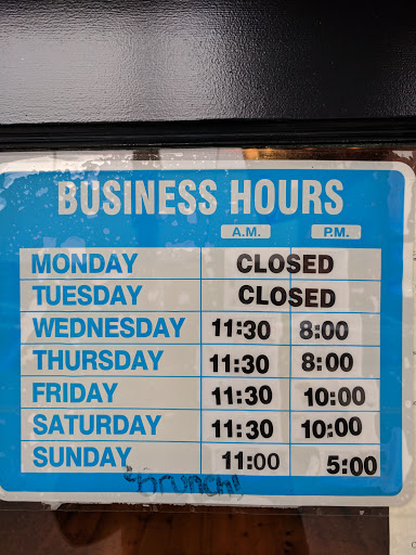 | Working: | Closed Closed 11:30AM–8PM 11:30AM–8PM 11:30AM–10PM 11:30AM–10PM 12–6PM |