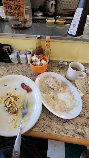 Small place but really good! Not too pricey real laid back especially for people comin from camping! Small interior but there is outdoor seating. Normal complaints from outdoor seating sun flies bees. Food was fantastic real food! My husband said the corn beef and hash was the best he has ever had and was real homemade stuff! I went simple cheese and ham omlette delicious and so was the biscuits and gravy!!