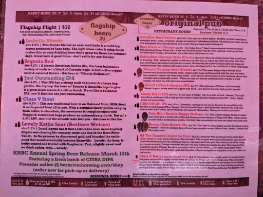 This is a great locals hang out. You are able to get a yummy beer and a burger while you sit amongst the locals to find out where the best spot to fish might be. There are a few "old-timers" (to the Kernville area) that work there who can give you the inside scoop on which trail to mountain bike etc. There are always 4 good old standby brews there: Isabella Blonde, Sequoia Red, Just Outstanding IPA and Class V stout. The brewmaster has always got something new on tap that hes recently tried... perhaps a pumpkin, wheat or new hop. Always ask the bartender for a "try" first. He/she will always oblige with a taste before you plunge into your beer decision. There is a nice outside atmosphere too where families enjoy grass and flowers while eating. Theres always a dog bowl out in case you have a thirsty pooch! Go to KRBC, you wont be disappointed. I love it there!