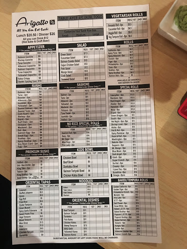 Great selection of menu items. Reasonable AYCE prices for both food AND drinks. Fish-to-rice ratio is exceptionally generous, which makes this restruant visit a 5 star value. Service is well organized, efficient and friendly.