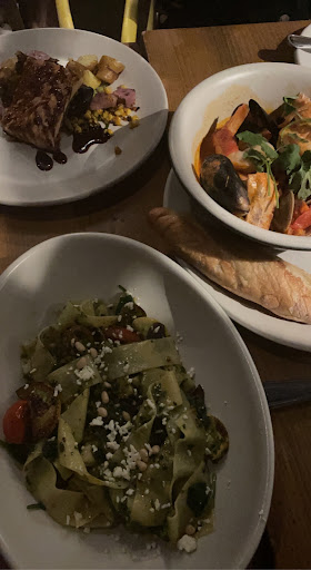 We are a family of four with two kids under 10. The hostess was not present while we waited to be seated, & has a feeling no one was going to come. Once we were seated, we had a nice view of the ocean. i was talked into ordering a glass of wine & was surprised that not only did they not offer Riesling or a Moscato, the glass itself was less than half full. My husband and son ordered a salad with their burger, as no side items came with the burger. The "salad" was a small amount of mixture of greens placed on the same plate as the burger. My son thought it belonged on the burger! The house dressing" was non existent & if it was present, it had a bland taste. My $28 lobster risotto was good, but scant lobster meat was found in it and did not come with a salad. So two Angus burgers, lobster risotto, kids spaghetti, glass of Chardonnay wine & three carbonated beverages was $95 w/o tip. Not worth it. I picked this restaurant from an internet search. If you are looking for over priced barley there portions and a la carte add ons- this is your place.