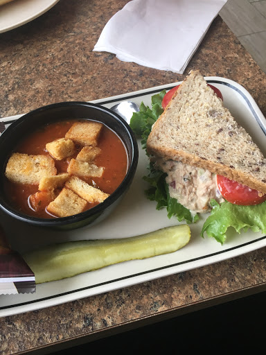Friendly service, large clean space, and an outdoor patio that is great to use during sunny days. The parking lot is a little scary. Extensive menu with the option to combine different items much like Panera. Tasty food and a very tempting dessert display.