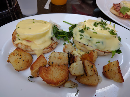Great service and cute patio. Its a bit loud outside worth the traffic but still nice to get a little glympse of the ocean. The filet Mignon Benedict was a neat twist but surprisingly bland. The hollandaise sauce was great and I liked how it was served over a potato pancake. The surprise for me was the fresh fruit: pear, strawberries, kiwi, apples, and oranges! The honey latte was tasty...perfect bitter/sweet balance.