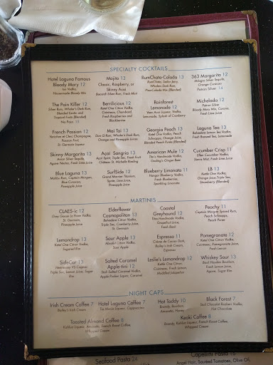 We ate here several times as we were staying in the Hotel Laguna. The food for dinner is fantastic, the drinks were ok but very over priced. Service for dinner was good and the sunset was awesome. We went for breakfast and found their burritos to be waaaay two small and over priced. $14 for a breakfast burrito and I was still very hungry afterward. Service in the morning was terrible, it took 45 minutes to order our food, they were not that busy. The prices definitely reflect atmosphere which was very nice.